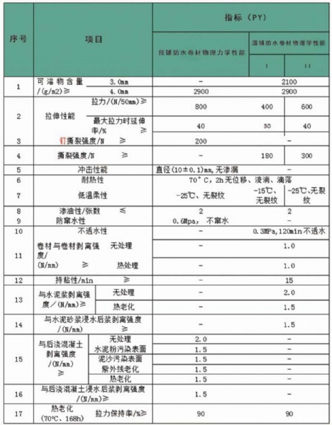 GB23457-2009PY類《預(yù)鋪/濕鋪防水卷材》標(biāo)準(zhǔn)。